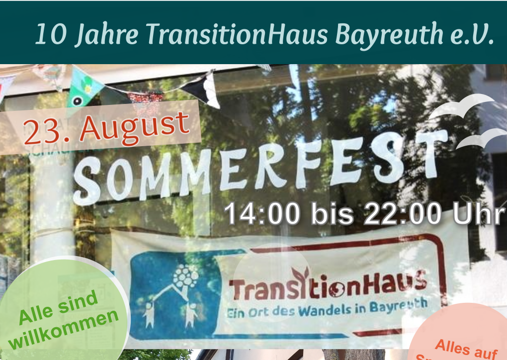 Wir freuen uns schon jetzt auf ein buntes Fest voller Begegnungen, Spaß und Engagement für den sozialen und ökologischen Wandel in Bayreuth! 🌸 Lasst uns gemeinsam 10 Jahre TransitionHaus Bayreuth feiern!