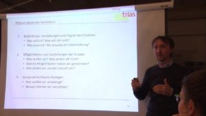 Genossenschaftsmodell über die Kommanditgesellschaft bis hin zum Erbbaurecht über die Stiftung trias, vorgestellt. Das war nicht nur für Privatpersonen oder Gruppen spannend, die sich eine solche Form des Wohnens vorstellen können, sondern auch für uns als TransitionHaus boten sich einige spannende Visionen. Darüber werden wir im Rahmen der neuen Haussuche auch in der “Zukunftswerkstatt” noch einmal weiter nachdenken. Besonders die auf Verhinderung von Privateigentum angelegten Modelle des Freiburger Mietshaussyndikats oder des Erbbaurechts der Stiftung trias sind in dieser Hinsicht spannend. Doch auch für Privatpersonen und -gruppen scheinen diese Themen interessant zu sein. Die Studienprojektgruppe hat das rege Interesse auf jeden Fall schon einmal an die Lehrstühle weitergegeben und viellei